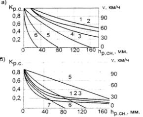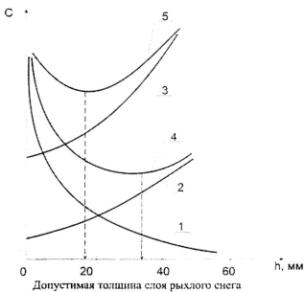 Рис. 15.5. Влияние толщины слоя снега на обеспеченность расчётных скоростей: Особое значение имеет соблюдение указанных требований при организации патрульной снегоочистки. Допустимая толщина слоя рыхлого снега, накапливающегося на дороге, зависит от интенсивности снегопада и времени между проходами снегоочистительных машин, называемого временем снегонакопления. Поэтому количество патрульных снегоочистительных машин прямо зависит от допустимой толщины слоя рыхлого снега, который накапливается в перерывах между проходами машин: