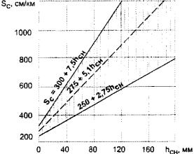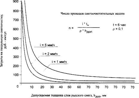 hдоп - допустимая толщина слоя снега на покрытии, мм; L - длина участка дороги, км; В - ширина очищаемой поверхности, м; Vраб - скорость снегоочистителя, км/ч; Кb - коэффициент использования рабочего времени (может быть принят 0,7-0,9); b - ширина захвата снегоочистителя, м. Поэтому и затраты на патрульную снегоочистку в наибольшей степени зависят от допустимой толщины слоя рыхлого снега на покрытии во время снегопада и интенсивности снегопада (рис. 15.6). При допустимой толщине слоя снега менее 30-20 мм затраты на снегоочистку стремительно растут.