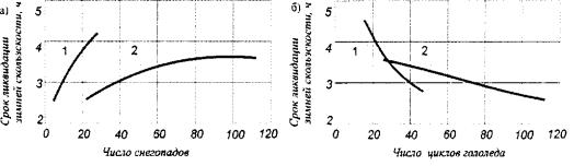Рис. 15.8. Зависимость сроков ликвидации зимней скользкости от повторяемости гололёда и снегопада: