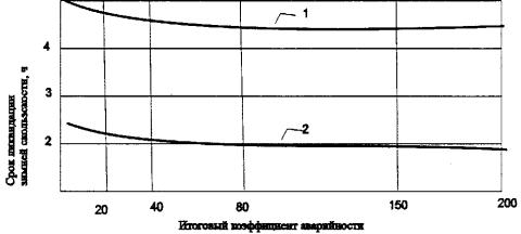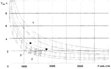 Рис. 15.9. Зависимость сроков ликвидации зимней скользкости от итогового коэффициента аварийности: Наибольшее влияние на экономически эффективные сроки ликвидации зимней скользкости и снежных отложений оказывает интенсивность движения (рис. 15.10), которая и должна быть положена в основу градации требований к директивным срокам ликвидации этих явлений, т.е. сроки должны быть дифференцированы именно по интенсивности движения.