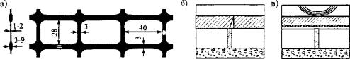 Рис. 17.12. Армирование асфальтобетона и песчаного слоя основания (обозначения см. рис. 17.11): Армирование сопряжения старой и новой дорожных одежд может быть выполнено в одной вертикальной плоскости, представляющей собой зону максимальной концентрации напряжений. Эти напряжения можно существенно уменьшить, если расширить зону стыка. На рис. 17.13 показан вариант сопряжения, в котором фрезерование старого покрытия выполнено уступом, а армирование новых слоев асфальтобетона - двухслойным с соответствующим смещением верхнего армоэлемента относительно нижней прослойки.