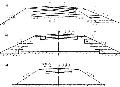 Рис. 17.10. Схемы уширения дорожной одежды: Двустороннее уширение может быть выполнено двумя способами: устройством полос уширения дорожной одежды на уширенном с двух сторон земляном полотне (рис. 17.10, б), уширение проезжей части на ширину, в 2 раза меньшую ширины обочины, или на ширину краевых укреплённых полос (т.е. с каждой стороны на 0,25-0,75 м) без уширения земляного полотна (рис. 17.10, в). В первом случае на обочине вдоль кромки покрытия подготавливают корыто до низа дополнительного слоя основания (дренирующего или морозозащитного). Дну корыта придают поперечный уклон 30-170 ‰ в сторону обочины, чтобы обеспечить водоотвод из основания. При устройстве полос малой ширины (0,25-0,75 м) применяют траншеекопатели и приспособления к машинам, в том числе навесные и прицепные плуги, накладки на отвал автогрейдера или бульдозера, а также механизмы для уширения проезжей части. Технологический процесс устройства дорожной одежды на полосах уширения включает обрезку кромки покрытия с помощью дисковых пил, навешиваемых на трактор, послойную отсыпку основания с тщательным уплотнением каждого слоя, строительство покрытия. На полосах уширения при необходимости устраивают поверхностную обработку, захватывая на 0,2-0,3 м прикромочную полосу старого покрытия. Поверхностную обработку целесообразно устраивать сразу на всю ширину, перекрывая старое покрытие и полосы уширения. Во втором случае после уширения и уплотнения земляного полотна до нижней поверхности дополнительного слоя основания (дренирующего или морозозащитного) отсыпают материал для уширения основания, затем укладывают и уплотняют его и вровень с ним отсыпают и уплотняют грунт в пределах образуемой новой обочины. После этого укладывают выравнивающий слой (при необходимости), а поверх него новый верхний слой покрытия на всю ширину проезжей части. Затем укрепляют обочины и окончательно отделывают земляное полотно. Для обеспечения лучшего сопряжения нового и старого покрытий применяют различные способы армирования асфальтобетона на участках уширения дорожных одежд (рис. 17.11-17.14) (Аливер Ю.А. Применение геосинтетических материалов для повышения трещиностойкости асфальтобетонных покрытий на реконструируемых участках автомобильных дорог // (Применение геосинтетических и геопластиковых материалов при строительстве, реконструкции и ремонте автомобильных дорог. - М., - 2001. - 162 с. - (Тр. / Союздорнии; Вып. 201). На рис. 17.11 показано однослойное армирование продольного шва при расширении существующей дороги. В этом случае армирующий рулонный геосинтетический материал устанавливают под верхний слой асфальтобетона или непосредственно на подготовленную поверхность цементобетонного основания. В конструкции дорожной одежды такой материал воспринимает растягивающие усилия, возникающие от температурных и транспортных нагрузок, и сдерживает развитие трещин в зоне стыка. При этом длина анкеровки должна быть не менее 0,5 м, а для жёстких материалов (стеклосетки, полиамидные сетки) - больше.