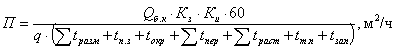 Qб.к - вместимость бака для краски, л; q - удельный расход краски, л/м2; tразм - суммарная продолжительность операций по разметке за период опорожнения бака для краски, мин; tn.з - продолжительность подготовки заключительных операций, мин; tокр - продолжительность процесса окраски линий безопасности, мин; tnер - суммарная продолжительность переездов от одного объекта к другому за период опорожнения бака, мин; tраст - суммарные затраты времени на размещение и сбор столбиков, мин; tт.п - продолжительность переезда машины к месту заполнения бака краской и обратно к месту работы, мин; tзап - затраты времени на заполнение бака краской, мин. Некоторые из приведённых величин: