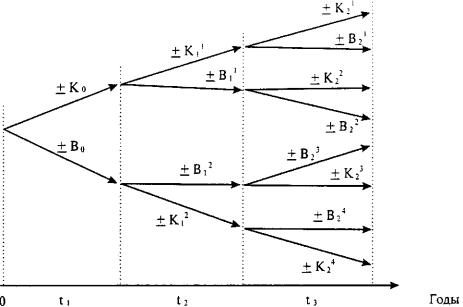 Рис. 22.4. Фрагмент функциональной модели стратегий ремонта дороги Функциональная модель строится в заданном временном периоде функционирования дороги, где в начале каждого его промежутка (0, t 1,.., tn) может быть принято решение о выделении затрат на проведение капитального ремонта (+К) или ремонта (+В). Нижний индекс при К и В (рис. 22.4) указывает на срок принятия решения о соответствующем виде ремонта, а верхний индекс - на признак отнесения их к той или иной стратегии ремонта. Если же решение о капитальном ремонте или ремонте в рассматриваемом промежутке времени не принимается, вместо затрат на выполнение ремонтов указываются транспортные потери от их невыполнения (-К; -В). Оптимальная стратегия ремонтов устанавливается по минимальной сумме оценок затрат на их выполнение и транспортных потерь на каждом пути в функциональной модели в заданном временном периоде. Поиск оптимального решения осуществляется на основе рекуррентных уравнений и представляет собой многошаговый процесс. На каждом шаге осуществляется отбраковка некоторого множества вариантов-последовательностей ремонтных воздействий как заведомо нецелесообразных, которая заканчивается при достижении заданного критерия оптимальности. Определение рационального варианта производства ремонтных работ (зоны ремонтных работ). Решение этой задачи базируется на рассмотрении взаимодействия двух подсистем, участвующих в транспортном процессе: потока движения автомобилей и ремонтируемого участка дороги. Зона ремонтных работ состоит из основного ремонтного участка и участка, по которому осуществляется движение в период ремонта. Она характеризуется определенным составом ремонтных работ, порядком их выполнения, применяемыми техническими средствами и способами пропуска через неё. В общем случае имеется множество вариантов сочетания параметров функционирования указанных подсистем, которые могут приводить либо к увеличению, либо к сокращению зоны ремонтных работ и соответственно либо к ускорению, либо к снижению скорости движения автомобилей при ее прохождении. Ускорение проезда автомобилями зоны дорожно-ремонтных работ в связи с ее сокращением вызывает снижение себестоимости перевозок грузов и пассажиров, но обычно связано с ростом дополнительных расходов на производство работ. Поэтому в качестве критерия решения данной задачи должен использоваться минимум совокупных (приведенных к одному моменту времени) затрат на организацию ремонтных работ и осуществление транспортного процесса через зону ремонтных работ. Учитывая сложность и многовариантность поставленной задачи, принципиальная схема решения которой показана на рис. 22.5, её реализацию рекомендуется осуществлять в четыре этапа.