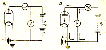 31. Для измерения анодного тока в анодную цепь включают миллиамперметр, а для измерения анодного напряжения— вольтметр (см. рисунок). На каком рисунке показано правильное включение приборов?
