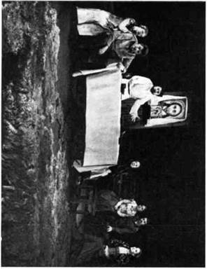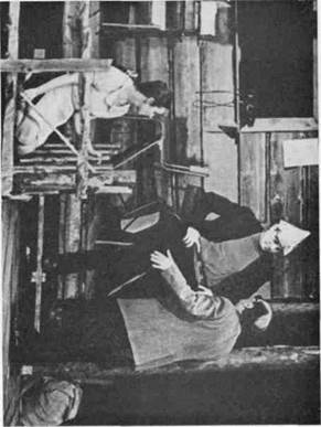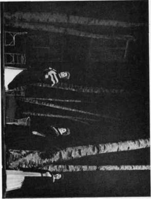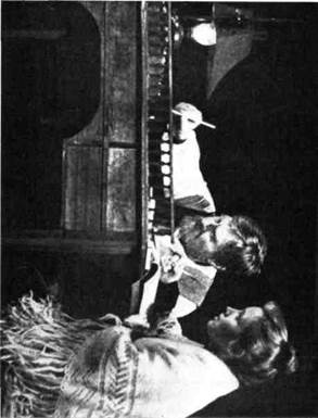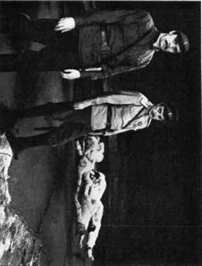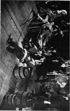 ¶Все эти элементы декорационно-пластического решения спек- »такля нашли свое конкретное воплощение в работе художника А. Ф. Босулаева. Дорога стала главной частью постоянного станка, поставленного на вращающийся сценический круг. При поворотах круга в различных ракурсах и сочетаниях, снабженная скупыми деталями, точно обозначающими место действия, спираль дороги каждый раз воспринимается по-разному: то как нижняя палуба военного корабля; то как часть набережной, по которой уходит полк, начиная свой путь от Кронштадта до Таврии; то как пыльный проселочный тракт в просторах Украины, возле которого прилепилась глиняная мазанка, где разместился штаб Комиссара; то как древний курган где-то в степях Таврии, на вершине которого уже тысячелетия стоит каменная скифская баба. Изображение неба было решено художником при помощи расположенного в глубине сцены полукруглого горизонта, на который с мостков, помещенных на колосниках, специальные проекционные аппараты проектировали различные «небеса» — лазурно-спокойные, грозно надвигающиеся, свинцово нависшие над землей, звездные с раскинутым по всему куполу Млечным Путем,— всякий раз точно соответствующие характеру сцены, ее ритму и эмоциональной окраске. Большого труда в работе над оформлением спектакля стоили поиски и определение мест действия в пьесе. Дело в том, что «Оптимистическая трагедия» разделена Вишневским на три акта, а внутри актов никакого деления на картины, сцены или эпизоды нет. Идет свободное драматургическое повествование, иногда прерываемое монологами Ведущих с развернутыми эмоциональными ремарками, очень общими и скупыми в той их части, которая касается конкретизации мест действия. Кроме того, надо было решить сценическое пространство так, чтобы всегда было какое-то постоянное место для Ведущих, позволяющее во время их обращений в зрительный зал производить беспрепятственные перестановки на сцене. И такое решение сценического пространства было найдено. Ведущим была отдана авансцена и оркестровая яма, покрытая специальной системой мостков со ступеньками в зрительный зал. Круг, на котором стоит постоянный станок спектакля, при переменах картин перекрывается обычным театральным занавесом, за которым производятся необходимые трансформации мест действия. В своем окончательном виде декорационно-пластическая композиция приобрела следующий вид: Акт первый V Пролог. Выход Ведущих через зрительный зал на центральный помост. Первая картина. Нижняя палуба. (Выход Ведущих.) ¶Вторая картина. Логово анархистов — еще более закрытое помещение нижней палубы. (Выход Ведущих.) Третья картина. Верхняя палуба. Выход Ведущих. Поворот круга. Прощальный бал. Поворот круга — Марш полка. Акт второй Четвертая картина. Ночной бал. (Выход Ведущих.) Пятая картина. Стоянка Комиссара. (Выход Ведущих.) Шестая картина. Стоянка Вожака. Акт третий Седьмая картина. Штаб Комиссара. (Выход Ведущих.) Восьмая картина. Ночной караул. Девятая картина. Бой у каменной стены. (Выход Ведущих.) Десятая картина. В плену. Поворот круга — Рапорт Командира. Поворот круга — Смерть Комиссара. Эпилог В заключение хочется сказать об активной творческой роли художника А. Ф. Босулаева в создании декорационно-пластического образа трагедии. Спектакль многим обязан острой и своеобразной творческой мысли А. Ф. Б