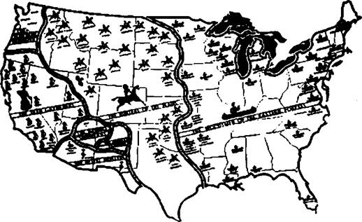 Фрагмент карты культурных ареалов индейцев Северной Америки К. Уисслера. Источник: Three Maps of Indian Country. United States Bureau of Indian Affairs. Lawrence, Kansas, 1948 16 WsslerC. The American Indian. N.Y., 1917. 17 См.: Woods С A Criticism of Wissler's North American Culture Areas//American Anthropologist. New Ser Интересна попытка Уисслера картографировать распространение целого ряда культурных явлений: гончарство, ткачество, типы обуви, пластика, ареалы маиса и маниоки, материнский и отцовский род18. К. Уисслер высоко оценивал роль женщины в становлении аборигенной культуры. Ученый писал: «Мы знаем, что индейская женщина сделала для процветания своего народа не меньше, чем мужчина. Она была выносливым работником, хорошим мастером, квалифицированным ремесленником, незаурядным художником, до некоторой степени архитектором, земледельцем, путешественником, рыболовом, охотником, врачом, проповедником, а при нужде и вождем»19. Одна из заслуг женщин заключается в том, что индейцы были очень чистоплотны, регулярно мылись в банях. Они считали, что бледнолицые заражают воздух и распространяют болезни. В середине XX в. географ Карл Сауер (1889-1975) реанимировал забытое на некоторое время понятие культурного ареала. Новый этап в развитии идей принадлежит ему и его коллегам по университету в Беркли Альфреду Креберу и Роберту Лоуи. Теорию культурного ареала особенно подробно разработал американский антрополог Альфред Луис Кребер (1876-1960). Основные взгляды на культуру изложены в его «Антропологии» (1923). Вслед за Ф. Боасом он отказался от идей эволюционизма, т.е. признания универсального для всех стран культурного прогресса, и от принципов функционализма. За единицу отсчета взят «культурный ареал» — четко определенный географический район, который выделялся сходством значительного числа культурных черт. Внутри него выделялся «культурный центр» — область наибольшей концентрации культурных черт, а также «культурные границы» — места пересечения данной культуры с другими, где постепенно ослабевают признаки собственной культуры и нарастают заимствования из соседних ареалов. Развитие культуры складывается из внутренних инноваций и внешних заимствований. Те и другие могут действовать двояко: либо тормозить, либо ускорять развитие. Неудачное нововведение, как и неудачное заимствование, замедляет культурный рост. И наоборот. К неудачным относится то, что противоречит сложившимся традициям. Народы, накопившие наибольшее число удачных инноваций и заимствований, оказываются сильнее конкурентов. Сильные культуры легко переживают глубокие кризисы и имеют несколько пиков развития (у Китая и Индии их было 2, у Англии — 3, у Германии и Японии — 4). Длительность локального подъема культуры продолжается от нескольких десятилетий до нескольких столетий. Кроме локальных, существуют общемировые пики. Два мощных всплеска в человеческой культуре наблюдались в VI—V вв. до н.э. и XI— XII вв. н.э., связанные с появлением крупных философских систем. Развитие духовной сферы (философии и искусства) не зависит от экономики, а развитие науки напрямую определяется характером политической системы и уровнем экономики. Зависимость от религии имеет иную закономерность: философия, искусство и наука достигают зрелости, освободившись от религии, но не порвав с ней: все великие деятели фило- IS Подробнее см.: Wissler С. Man and culture. N.Y., 1923. 19 Фостер У.З. Очерк политической исто