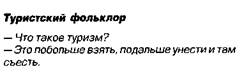 Туризм — массовая болезнь среднего класса В состав туристской субкультуры следует включать: а) вещевые компоненты (туристскую одежду, туристские принадлежности, в том числе рюкзак, палатку, котелок, костер и т.д.); б) вербальные жанры (рассказы, сказки, анекдоты); в) ритуально-поведенческую составляющую, к примеру, обряд посвящения в туристы, суеверия. Мифологическая проза туристов включает три основных жанра — былички, поверья и мифы (рассказы о происхождении сверхъестественного существа). В состав субкультурной письменности входят дневники походов, карты, схемы маршрутов, лирика, песни-переделки, шуточные грамоты, частушки, гимны; пародийные «документы», эмблемы, самодельные медали, ордена, кроссворды, приглашения, литературные произведения, посвященные, как правило, каким-либо событиям в жизни группы, и др. К ним примыкают надписи на различных предметах обихода (ножах, ложках, штормовках, палатках — т.е. граффити)"5. Некоторые из этих документов функционируют самостоятельно, другие объединяются в единый метажанр — альбом. 3 Ферапонтов И.Е. Туристский быт и фольклор: Опыт системного анализа (http://ivgi.rsuh.ru)- Записи туристского фольклора, проведенные с 1996 по 2000 г. уральскими студентами-филологами, касались самых разных жанров — это былинки, рассказы о непонятных случаях, паремии, приметы, поверья, обряды, игры и др. Записи производились путем прямого опроса, при этом выяснялся контекст исполнения, т.е. когда, кем, с какой целью воспроизводились те или иные тексты. Задавались также вопросы, направленные на выяснение степени доверия исполнителей к текстам, специфики отношений внутри туристской группы, иерархии, распределения обязанностей на маршруте, особенностей общения в условиях города"6. Среди туристов распространение получили наивно-оккультные увлечения, когда на маршруте или в походе выходного дня с помощью различных магических приемов разгоняли облака, отгоняли дым, лечили или пытались лечить людей и т.п. Ироническая конкуренция представителей разных видов туризма очень походит на традиционные присловья и анекдоты о жителях разных местностей. Например, спелеологов в шутку зовут «спелеолухами», альпинистов — «альпиноидами», водников — «мокрозадыми». Горники говорят, что «водники жрут неумеренно, потому что у них ограничений по весу нету, и таскают с собой всякие деликатесы, вплоть до огурцов в банках»"7. Рассказы, напоминающие о моральных заповедях туризма, отличаются большей серьезностью, вплоть до трагизма. Как правило, это предания о погибших туристах и истории о мифологических персонажах. Среди персонажей туристской демонологии наиболее известны Черный Альпинист и Белый Спелеолог. Коренное отличие туристской субкультуры от фольклорных костров в крестьянском образе жизни — временность, эпизодичность, условность, направленность исключительно на досуг. В этой культуре как часть домашнего быта особое место занимают пение, декламация стихов, дружеские шаржи, танцы со своеобразной интермедией процесса пения. В 1960—1970-е гг. сформировалось так называемое локальное песенное творчество — факультетские песни, капустники, посвящения друзьям и т.п."8 Туристский фольклор разнообразен в жанровом отношении: он включает в себя песни, предания, поверья, былички, бывальщины, анекдоты, присловья, приметы, пословицы, поговорки, с