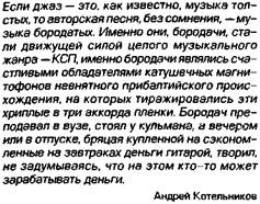 Авторской песне полагается звучать в замкнутом пространстве — на кухне, в камерном зале, подъезде, подворотне, вагоне поезда, возле костра. По выражению Александра Галича, авторская песня часто является историей чьей-то жизни, рассказанной песенным монологом. Она очень чутка к бытовой интонации современников. Мелодии извлекаются из хождений по улицам, из поездок в метро и в автобусе. Это почти разговорная интонация, и она у всех «на слуху». Как рассказывает Михаил Анчаров, сначала пишется стихотворение, в котором он выражает сокровенные мысли о мире, людях и себе. Затем он эти стихи начинает скандировать. Получается напев, органически вытекающий из интонации текста. Музыкальное воплощение такой песни очень часто оказывается скупым, но оно неотделимо от слов и работает на подчеркивание смысла слов. Плохо, когда человек приписывает себе чувства, которых не испытывает, а берет напрокат. Отсюда либо жеманство, либо преувеличения, либо риторика. Из огромного числа авторских песен лишь лучшие становятся достоянием широкого круга исполнителей и попадают в «золотой фонд», становясь традиционными, по крайней мере, для двух-трех поколений туристов. Авторская песня — самодеятельное песенное творчество, зародившееся в СССР в конце 1950-х, предполагающее, что один и тот же человек сочиняет слова и музыку, а также исполняет собственные произведения в кругу друзей и знакомых, не получая материального вознаграждения. Сегодня на пространстве бывшего СССР действуют десятки, а может быть и сотни школ, в которых талантливые педагоги обучают детей и молодежь основам гитарного аккомпанемента на основе особенного песенного жанра — авторской песни. Когда-то полулегальный жанр ныне получил всеобщее признание. Проходят большие и маленькие фестивали, издаются диски и книги, антологии и даже учебники — для факультативов по литературе в средней школе. В авторской песне можно отметить много течений, направлений, традиций. В 1960-е гг. в нашей стране возникает новое направление неформального молодежного движения, названного КСП (клубы самодеятельной песни). Оно олицетворяло собой идеологию романтизма, которая, во-первых, включала в себя критику монетаристского, подчиненного принципам рациональности устройства капиталистического общества и сопутствующего ему буржуазного стиля жизни, ограниченного ценностями мещанского, потре- См.: Шостак Г.В. Массовые музыкальные жанры XX века в системе музыкально-эстетического воспитания: Учеб.-методич. пособие. Брест, 2002. бительского мировоззрения, и, во-вторых, ориентировалась на поиск новых идеалов общественного устройства и гармонично развитой личности121. Отсюда пошел культ дороги, туристского маршрута и нового «культурного протестанта» — советского барда. Бард, как новый «культурный герой» — романтик, не мещанин, это другой образ мира. Во второй половине 1950-х — начале 1960-х гг. становятся известными такие самодеятельные авторы и исполнители: Александр Городницкий, Борис Полоскин, Валентин Вихорев, Валентин Глазанов, Владимир Лосев, Валерий Сачковский, Евгений Клячкин, Леонид Нахамкин, Арон Крупп,