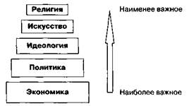 70 Маркс К., Энгельс Ф. Соч. Т. 13. С. 7. экономических (базисных) факторов, превратным отношением которых она является. Ее общественная функция заключается в том, что она определенным образом интерпретирует существующие отношения, а не продуцирует их. Религия есть идеология, ее самая ранняя, исторически первая форма. Ее социальная функция — функция идеологическая: она или оправдывает и тем самым узаконивает существующие порядки, или осуждает их, отказывает им в праве на существование. Она может питать социальный конформизм, слу- ' жа тормозом общественного развития, или же стимулировать социальный протест, играя революционную роль71. В социальной теории Маркса определяющая роль в развитии общества принадлежит не сознанию, а бытию. Бытие определяет сознание, взаимоотношения людей, их поведение и взгля Марксизм исходит из утверждения, что характер надстройки определяется характером базиса. Это значит, что экономические отношения в значительной степени72 определяют возвышающуюся над ними надстройку, т.е. совокупность политических, моральных, правовых, художественных, философских, религиозных взглядов общества и соответствующих этим взглядам отношений и учреждений. Поскольку сменяется природа базиса, постольку меняется и природа надстройки. Поэтому можно, например, ожидать, что феодальная политическая структура будет существенно отличаться от капиталистической прежде всего в силу того, что способы организации хозяйственной жизни в этих двух формациях существенно отличаются друг от друга. Отношения между базисом и надстройкой разворачиваются так. Базис обладает абсолютной автономией и независимостью от надстройки. Надстройка по отношению к базису обладает лишь относительной автономией. Отсюда следует, что подлинной реальностью обладает прежде всего экономика, отчасти — политика, т.е. она реальна — с точки зрения влияния на общественную формацию — лишь во вторую очередь. Что касается идеологии, то она реальна уже как бы в третью очередь. Она важнее искусства, но См.: Гараджа В.И. Религиоведение: Учеб. пособие. М., 1995. Но не целиком и полностью, как иногда считают сторонники экономического детерминизма. Некоторый люфт существует. Если бы между уровнем экономики страны и степенью развития культуры существовало строго однозначное соответствие и жесткая связь, то самой разнообразной культурой обладали бы самые богатые страны. Но так происходит далеко не всегда. Есть счастливые исключения. Одно из ярких — российское общество. Вот почему, на наш взгляд, можно говорить лишь о 70%-ной детерминации надстройки со стороны базиса. менее ценна, чем экономика или политика. А о религии Маркс вспоминал только со знаком «минус». Так и выстраивается незримая (ибо явно Маркс нигде этот момент не прописывал) иерархия важности подсистем общества (рис. 23). В самом верху, почти за облаками, скрывается религия. За ней в низ шкалы спускается искусство, которому у Маркса отводится незаслуженно мало места. Чуть ближе к базису располагается идеология, совсем близко размещается политика. Чем ближе к базису, тем выше ценность этой сферы общества с позиций марксизма, и наоборот. Такая позиция в трактовке социальной системы, как вполне справедливо заметил А.Б. Гофман, резко отличает Маркса от Конта, для которого наука, мораль и религия — это действующие, пр