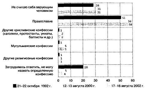 Источник: Фонд «Общественное мнение»: Религиозность и воцерковленность (http://bd.fom.ru) Уровни религиозности можно определять и описывать по привычной пятибалльной шкале: очень высокий; высокий; средний; низкий; очень низкий. Религиозность населения можно измерять не только по количеству верующих в той или иной конфессии, например на основе социологических опросов, выяснив у респондентов конфессиональную самоидентификацию, но также глубину и устойчивость религиозных верований, иными словами, рассматривая религиозность как феномен массового сознания. Р.А. Лопаткин предлагает измерять рост уровня религиозности по доле верующих в общем составе населения и повышением степени религиозности, т.е. глубиной веры, интенсивностью религиозных переживаний и культовых действий40. Социально-экономические перемены, произошедшие в России в 1990-е гг., не могли не отразиться на религиозном сознании и его показателе — уровне религиозности населения. Резко возросла религиозность. Согласно исследованиям середины 1980-х гг., к верующим относили себя около 10% взрослых, 38 Старые церкви, новые верующие. Религия в массовом сознании постсоветской России / Под ред. 39 Свящ. Вигилянскии Вл. Новое исследование по старым рецептам // Новый мир. 2001. № 4. 40 Лопаткин Р.А. Конфессиональный портрет России: к характеристике современной религиозной в середине 1990-х гг. — уже 40%. При этом православные до перестройки 1985 г., по одним данным, составляли 6—8%, по другим в 1989 г. их было около '/з, в 1990 - 46%, в 1993 - около '/2, в 1994 - 57%, в 1995 - 42%, в 1996 -около 43% от всего населения. В 1997 г. были получены четыре разных результата по доле православных: 45, 49, 50 и 55,6% населения. Более высоких показателей зафиксировано не было: в 1998 г. 51%, в 1999-м — 54% москвичей41. Иными словами, до перестройки каждый 20-й идентифицировал себя с православием, к началу 2000-х гг. — примерно каждый второй42. Согласно общероссийскому опросу Института социологического анализа, в 1997 г. 49% жителей России старше 18 лет считали себя православными, 37,4% — не считали себя верующими, 41 Пейкова З.И. Отношение к Церкви в России и других странах//Исторический вестник. 2000. №9—10. 42 Возможно, произошла стабилизация процесса самоидентификации. Зубов А.Б. Православная вера, национальная психология и политика // Полития. Вести, фонда «Российский общественно—политический центр». М., 1997—1998. № 4 (6). С. 28. 44 Социальное и национальное. Опыт этносоциальных исследований по материалам Татарской АССР. 45 Там же. С. 137-138. Гузенкова Т.С, Коростелев А.Д. Этнокультурная ситуация в республиках Российской Федерации. М., 1994. Возрождение культурных ценностей Ислама в национальном движении и повседневном поведении татар (www.mtss.ru). Элбакян Е.С, Медведко СВ. Влияние религиозных ценностей на экономические предпочтения россиян.//Социс, 2001, №8. ленное превосходство верующих над неверующими среди старшего поколения и обратное соотношение среди молодежи и лиц среднего возраста. Вероятно, с возрастом люди больше задумываются над проблемами жизни и смерти, а возможно, что скрывавшие в советское время свои религиозные убеждения пожилые люди сегодня смогли открыто о них заявить. По критерию грамотности неверующие в целом являются более образованными, чем верующие, которые преобладают только в группе людей, не имеющих законченного среднего образования. Имеют ученую степень, высшее, сред
