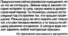 Воровской закон категорически запрещает жениться и иметь нормальную работу. Ворам в законе вообще нельзя общаться с представителями «гражданского» мира — как в тюрьме, так и вне ее. За него это делают приближенные, которых часто называют «бродягами». Если преступник был членом пионерской организации, комсомола или КПСС, однажды надел красный галстук или значок с изображением Ленина, он нарушил воровской закон и терял шансы стать вором в законе. Для того чтобы стать членом Коммунистической партии, требовалось две рекомендации от других членов партии, а для того чтобы быть принятым в воры надо было иметь три воровские рекомендации. Большую роль в процессе создания репутации вора в законе играет «крестный отец» — главный поручитель кандидата, обязательно авторитетный вор. «Крестные отцы» живут скромно и для окружающих — законопослушно. Конечно, они имеют дачу, машину, хорошую квартиру, но не шикуют. Не держат дома наркотики или миллионы в диване. Правда, среди своих, в закрытых катранах18, они нередко проигрывают в карты по полмиллиона. Вором в законе мог стать только кандидат с безупречной, с точки зрения «сходняка», репутацией. Малейшие сомнения продлевали срок его кандидатства. В тех случаях, когда преступник не мог стать вором в законе по объективным причинам (например: служил в армии, был членом комсомола и т.п.), ему могли присвоить звание «положенец». Это был человек с правами вора, но лишь до той поры, пока на его место (обязанности, территорию, право принимать решения) не станет претендовать вор. В тюремной субкультуре, как и в мире законопослушных граждан, царит двойной стандарт морали. Правда, здесь он принимает более сложный и запутанный вид. Первая двойственность возникает из разграничения морали для администрации и морали для заключенных — вторые не признают нормы поведения первых. Вторая двойственность формируется по линии разграничения «своих» и «чужих», т.е. сидящих за решеткой и всех остальных граждан. По отношению к не воровскому миру (миру фрайеров) со стороны блатных допустимо любое самое коварное поведение. Дуализм норм существует также внутри сообщества воров — между ворами и представителями других категорий осужденных. Наконец, каждая категория заключенных имеет собственные двойные стандарты, где, как и у блатных, оговариваются нормы поведения по отношению к своим и чужим". Обычай обязывал вора не скволыжничать и делиться награбленным со своими товарищами. Не поощрялось «мокрушество», «крысятничество», а насиль- 18 Катраны — игорные притоны, которые посещают дельцы теневого бизнеса. В 1970-х гг. при кат 19 Никулин Л. И. Россия худшая из тюрем?! // Отечественные записки. 2002. № 7. никам так и вообще был заказан вход в сообщество. Вор имел право лишить своего «коллегу» жизни только с согласия сходки. Оспаривать решения вора в законе, выступать с его критикой имел право лишь равный ему по званию. Тюремный закон суров, но, считают зеки, справедлив. При встрече новых арестантов, он гласит: тюрьма — это твой дом. По тюремному нормальная камера будет — правильная хата. Порядки здесь в основном те же, что и у правильных людей на воле: пришел из «дальняка» (туалета) — помой руки, садишься за стол — сними «лепень» (пиджак), нельзя свистеть — срок насвистишь. Братва рассказывает новичку о порядках в тюрьме, правило номер оди