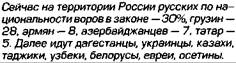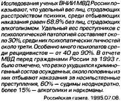Н. Баяркима Врезка ОБЫЧАИ И ВЗАИМООТНОШЕНИЯ Сплоченная воровская среда в России — явление очень древнее. Ее истоки относят к концу XV в. В XVIII в. существовали уже целые селения воров и разбойников, причем практически в каждой обжитой области страны. Тогда же сложились и обычаи преступников: вносить вклад в «общак» — общую кассу, проводить инициацию новых членов сообщества, наделяться кличками, общаться между собой на жаргоне («блатной фене» — и сами преступники стали называть себя «блатными»), ограничивать свободу возвращения членов воровского сословия в общество. Все эти обычаи сохранились по сей день. У тюремной субкультуры свои законы и представления о нравственности, которые не обязательно идут вразрез с общечеловеческой логикой. В неволе подследственные живут по одним и тем же внутренним законам. Без «причин» никто никого, как правило, не притесняет и не бьет. Никто, конечно, не заинтересован в том, чтобы администрация ужесточала внутренний режим в изоляторе. В тюрьмах живет плохо та категория подследственных, поведение которых идет вразрез с арестантскими представлениями о морали. Недостойным считается попрошайничество — человек сразу попадает в касту неприкасаемых. Долгожители тюремных стен считают: в этом замкнутом мире уважаем тот, кто умеет устроить свою жизнь так, чтобы не было Не так давно во многих российских газетах прошла информация о том, что в Бутырской тюрьме, в одной из камер, около двух десятков представителей криминального бомонда устроили целое пиршество. Подобного рода крутизна всегда стоит очень дорого. Опираясь на информацию, полученную от тех, кто недавно вышел на свободу, можно нарисовать весьма интересную картину. Если у вас есть большие деньги, тюрьма для вас будет как дом родной. Предположим, что вам надоело прозябать среди 40 заключенных, ютящихся в камере, рассчитанной на 10 человек. Пожалуйста, платите 250 долл. в сутки с человека, и вы будете коротать свой срок в такой же камере, но уже втроем. Или, к примеру, вас одолела тоска и захотелось развеять ее с помощью гашиша. Выкладывайте 200 долл. тому, кто вам его передаст (плюс стоимость самого гашиша), и наркотический кайф вам обеспечен. Захотели женской любви и ласки — 100 долл. «за проводку», и девочка у вас на нарах. Ну а если авторитету или вору в законе необходимо в течение дня побродить по зданию тюрьмы для решения своих вопросов, то за такого рода свободу надо выложить 500 долл. Однако помимо поборов с крутых уголовников существует еще мелкая дань, собираемая с простых смертных-заключенных, которые также пользуются по- добного рода услугами. Накрутка на основные товары: чай, сигареты, водку — составляет 300-500% от истинной цены. Она оправдывает риск, сопряженный с доставкой товара потребителю. Каналов, по которым товар поступает в колонию, несколько. Самый мощный из них сотрудники исправительных учреждений налаживают сами. Правда, не кооперативно, а каждый индивиду-