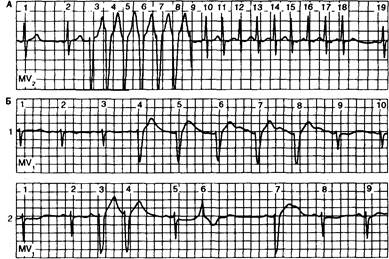 На рис. 4.15, А и Б показаны ритмограммы, полученные при предсердной тахикардии (150—180 уд/мин) у 2 больных в возрасте 19 лет и 51 года с анамнезом пароксизмов учащенного сердцебиения, но без каких-либо других признаков заболевания сердца. У первого больного, несмотря на частый ритм, аберрация не возникает, у второго же — в первых шести сокращениях наблюдается аберрация типа блокады правой ножки пучка Гиса. Последующие сокращения имеют нормальную конфигурацию. Запись на рис. 4.15, В и Г, сделанная у больных с коронарной болезнью сердца, демонстрирует аберрацию при последовательном понижении частоты (90 и 60 уд/мин) и минимальном сокращении длительности сердечного цикла. На рис. 4.15, Г аберрация имеет тип блокады левой ножки пучка Гиса. На рис. 4.16 показана запись, полученная у больной 35 лет с анамнезом пароксизмальной предсердной тахиаритмии на фоне ревматического поражения сердца. Электрокардиограмма на рис. 4.16, А получена во время приступа предсердной тахикардии при частоте 140 уд/мин. Обратите внимание: хотя частота тахикардии здесь ниже, чем в случае, показанном на рис. 4.15, А и Б, все комплексы имеют аберрацию, характерную для блокады правой ножки пучка Гиса. Восстановление синусового ритма обычно приводит к нормализации внутрижелудочкового проведения. Однако иногда слабо выраженная аберрация сохраняется в течение некоторого времени после восстановления синусового ритма (рис. 4.16, Б). Запись на рис. 4.17, полученная при холтеровском мониторинге у того же больного, что и на рис. 4.8, показывает вариабельность частоты, при которой может возникать аберрация у одного и того же человека в течение суток. Аберрация соответствует блокаде левой ножки пучка Гиса. На рис. 4.17, А показан 18-комплексный всплеск частой (185 уд/мин) пароксизмальной наджелудочковой тахикардии (комплексы 3—18), причем первые возбуждения (комплексы 3—7) имеют вариабельную аберрацию типа блокады левой ножки пучка, а последние девять — отражают нормальное внутрижелудочковое проведение, несмотря на отсутствие существенных изменений в частоте. На рис. 4.17, Б развитие аберрации двух преждевременных предсердных возбуждений (3 и 4) происходит при интервалах сцепления (0,64 и 0,68 с), эквивалентных частотам 90 и 95 уд/мин. На том же рисунке аберрация наблюдается при увеличившихся интервалах (0,76—0,80 с; частота — 75 уд/мин) в сочетании лишь с минимальным сокращением длительности синусового цикла. На рис. 4.17, А также отмечаются различия в интервалах сцепления, при которых аберрация появляется (0,44 с) и исчезает (0,32 с). В тот же день у этого больного наблюдалась аберрация типа блокады правой ножки пучка Гиса (см. рис. 4.8).