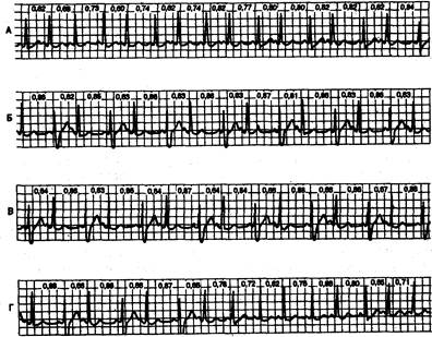 Рис. 4.18. Непрерывная ЭКГ (А—Г) в модифицированном отведении II, полученная у больной 78 лет во время начальной стадии острого переднесептального инфаркта миокарда. Комплексы QRS ретушированы. Величина интервалов R—R указана в секундах. На большей части записи наблюдается предсердная бигеминия. Обратите внимание на вариабельную аберрантность по типу блокады правой ножки в конце возбуждений с длительностью цикла ^0,76 с, а также на степень аберрантности, обычно связанную здесь с увеличением длительности цикла. Отметьте также комплексы в конце двух идентичных циклов в 0,76 с (запись Г}, один из которых имеет форму, характерную для неполной блокады правой ножки, а другой является нормальным. Обсуждение в тексте.