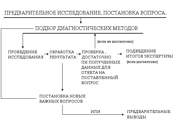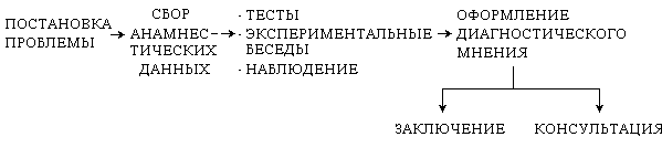 1. Формулировка проблемы на основании изучения всех сведений об индивиде (анамнез, специальные медицинские заключения, сведения об индивиде с точки зрения его успеваемости в учебном заведении, др.). 2. Формулировка гипотез и выбор диагностических методов. 3. Проведение тестирования; анализ полученных данных. 4. Формулировка заключений (например, об уровне психического развития). 5. Ответы на вопросы, поставленные на первом этапе. 6. Формулировка мероприятий, являющихся желательными на основании психологического заключения. Этапы психодиагностического процесса по Корманну