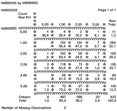 Теперь, выделив фрагмент целиком, преобразуем его в таблицу (рис. 60), как было описано выше. Последний этап заключается в том, чтобы обозначить в таблице заголовок, подлежащее и сказуемое, подставив вместо номеров варианты значения соответствующих переменных, а также изменить размеры и типы шрифта. Это и придаст нашему кросстабу окончательный вид (табл. 36). Аналогично составляются и редактируются таблицы в тех случаях, когда мы производим расчет не в процентах, а в средних значениях баллов тех или иных оценок.