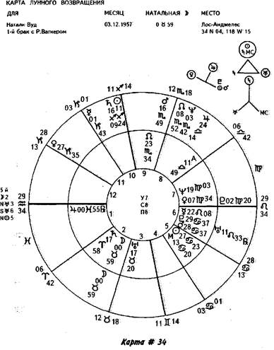 Поскольку Вагнер и Вуд поженились в декабре 1957 года, мы будем использовать их карты лунного возвращения на этот месяц. Новолуние, произошедшее в 29° Стрельца, попадает в третий натальный дом Натали и в седьмой дом карты солнечного возвращения, выдвигая на передний план в этом месяце тему контрактов и партнерства. Прогрессивная Венера Натали (планета любви) в 29°0Г Девы формировала секстиль с натальным Плутоном (планетой секса) — подходящий аспект для брака. Есть у нее и необходимый аспект седьмого дома, который мы обычно связываем с партнерским союзом, — прогрессивная МС в 0°59' Льва формировала квадратуру к натальной Луне в седьмом доме. Прогрессивный Асцендент в 26°59' Весов был в квадратуре к ее натальному Солнцу в десятом доме, акцентируя возможное изменение статуса. Луна Натали, находившаяся в натальном седьмом доме, переместилась в дирекциях солнечной дуги в 19° Тельца в трин с натальным Нептуном, намекая на звезды в ее глазах, когда речь заходила о Роберте. Дирекционный Плутон в 17°47' Льва формировал трин с натальным Сатурном в седьмом доме, что обычно указывает на прочные взаимоотношения. Но оппозиция дирекционного Юпитера в 19° Рыб к натальному Нептуну говорит о довольно нереалистичной позиции по отношению к любви и может предсказывать возможные проблемы, связанные с работой, поскольку Нептун управляет шестым домом Натали и находится в ее двенадцатом доме (который считается шестым (работа) домом партнера). В декабре 1957 года ее прогрессивная Луна в 23° Козерога формировала секстиль с натальным Северным Узлом во втором доме. Декабрьское новолуние в 29° Стрельца в седьмом доме карты солнечного возвращения указывает на то, что карта лунного возвращения на этот месяц может дать дополнительную информацию о партнерстве. В этой карте, построенной на 3 декабря 1957 года, на Асцендент приходится пятый натальный дом Натали, говоря о романтических отношениях и любви. Луна находится во втором доме ценностей, финансов и чувства собственной ценности. Натальный Уран (управитель Асцендента лунного возвращения) находится в третьем доме контрактов и изменения окружения. Уран лунного возвращения находится в шестом доме, указывая на новые паттерны привычек. Восходящей планетой является натальный Юпитер (рост и экспансия), он управляет десятым домом статуса.