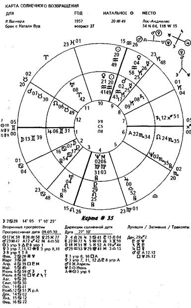 Как мы уже неоднократно повторяли, не существует способа предсказать смерть в карте. Однако, когда это уже свершившийся факт, его обычно легко можно увидеть. Чтобы подтвердить это, мы включили карты солнечного и лунного возвращения Вагнера и Вуд на год смерти Натали (1981 год). Прогрессивная Венера Вагнера в этом году (карта солнечного возвращения Роберта Вагнера на 1981 год #37 содержит всю относящуюся к делу информацию) находилась в 25° Овна в квадратуре к натальному Меркурию. Когда они поженились в 1957 году, его прогрессивная Венера была в секстиле к Меркурию. Поскольку Венера управляет его натальным седьмым домом, мы должны предположить какое-то действие, связанное с партнером. Управитель карты Плутон, находящийся в его восьмом натальном доме, становится в этом году директным, намекая на то, что ему, возможно, придется иметь дело с вопросами восьмого дома и Плутона (смерть, секс, трансформация). Любая планета, меняющая направление движения, особенно если это управитель карты, требует особого внимания. (См. Урок 3.) Единственная активность в дирекциях солнечной дуги — это вхождение Сатурна и Урана в новые знаки. Уран оказывается в 0° Близнецов в мае 1981 года, а Сатурн в 0° Рыб в конце ноября или начале декабря. В натальной карте Сатурн находится во втором доме, так что возможно новое направление в отношении Вагнера к ценностям, собственности и чувству собственной ценности. Сатурн управляет натальным третьим домом, так что можно ожидать, что произойдет какое-то событие, которое изменит его манеру общения или душевное состояние. Уран в натальной карте находится в пятом доме и является соуправителем третьего дома — опять указание на событие, связанное с кем-то, кого Вагнер любит, или на возможность несчастного случая из-за природы Урана, а также того, что он представляет собой фокальную планету тау-квадрата, включающего Луну и Сатурн. В этой карте сильно акцентированы дома завершения (четвертый, восьмой и двенадцатый). На Асцендент приходится четвертый натальный дом; Солнце находится в двенадцатом доме уединения и печали (или вдохновения и озарения); натальная Луна, представляющая его жену, расположена в четвертом доме. Положение управителей Асцендента (десятый и шестой дом) говорит о том, что это удачное время, чтобы сосредоточиться на карьере (десятый дом) и на работе (шестой дом). Так как на Асцендент солнечного возвращения приходится четвертый натальный дом, возможны изменения, касающиеся дома и семьи. Восходящий натальный Уран указывает на неожиданные события, но также привлекает внимание к творчеству и детям, потому что в натальной карте он находится в пятом доме. Дополнительным подтверждением того, что Вагнеру, возможно, придется иметь дело с неожиданными событиями, служит соединение Венеры солнечного возвращения с натальным Марсом в одиннадцатом доме солнечного возвращения. Несомненно, это указывает на споры с любимым человеком, так как эти планеты управляют третьим и девятым домами карты солнечного возвращения. Юпитер и Сатурн дополняют натальный тау-квадрат, превращая его в большой крест; его угловое положение в карте солнечного возвращения предсказывает очень активный и богатый событиями период. В случае Вагнера это оказались смертью партнера. Эти жеаспекты моглибы указывать на изменение места жительства (на Асцендент п