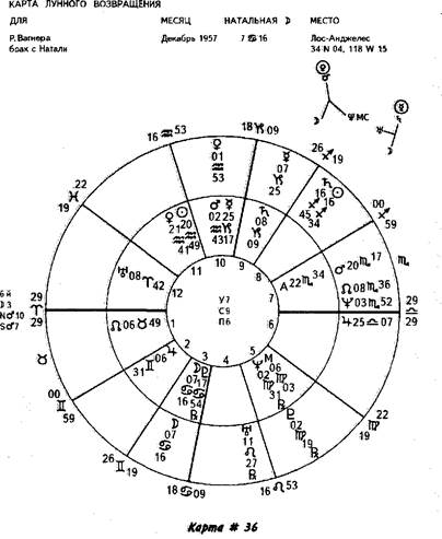Прогрессивная Венера в 25°27' Рыб, управитель его седьмого дома, формирует секстиль с натальным Меркурием. В натальной карте обе эти планеты находятся в третьем доме, который управляет контрактами, так что возможно деловое партнерство. Но поскольку здесь задействована Венера и солнечное возвращение указывает на изменение статуса, этот аспект служит подтверждением возможного брака. Прогрессивная Луна в 14° Рака формирует квинконс с прогрессивным Асцендентом в 14° Стрельца в конце ноября/начале декабря, говоря о том, что он может предпринять какие-то действия в течение этого периода. Дирекционная Венера в 18°50' Рыб формирует трин с натальным Плутоном (управителем Асцендента), а дирекционный Асцендент в 19°44' Стрельца приближается к секстилю с Солнцем Вагнера в третьем доме (управителю девятого дома юридических вопросов). Все это указывает на то, что мы должны построить карту лунного возвращенияна декабрь, чтобы увидеть, подтверждает ли она предполагаемые действия. В карте лунного возвращения (карта #36) на Асцендент в 29° Овна приходится шестой натальный дом. Вероятно, Вагнер заканчивал в это время какую-то работу, но это также может означать завершение периода отстаивания своих прав (Овен) и начало домашней жизни (Телец). Луна находится в третьем доме контрактов; натальный Маре — в десятом доме статуса; Марс лунного возвращения — в седьмом доме брака, все это очень показательно. Ближайшей восходящей планетой является натальный Юпитер, находящийся в натальной карте в седьмом доме, что сигнализирует об оптимизме и радости. Луна управляет четвертым домом лунного возвращения, находясь в третьем доме, что указывает на изменение семейной ситуации и на смену окружения, которые могут произойти в течение этого месяца. Карты солнечного и лунного возвращения подтверждают точность натальных карт Вагнера и Вуд, в чем приятно было убедиться. Зачем нам нужны карты лунных возвращений? Основная причина использования карт лунных возвращений связана с выбором подходящего времени для позитивных действий. Как уже говорилось раньше, мы не рекомендуем использовать астрологию для руководства вашей жизнью, но, обладая знанием, разумно попытаться работать с наилучшим возможным временем. Карты лунных возвращений очень полезны для этого.