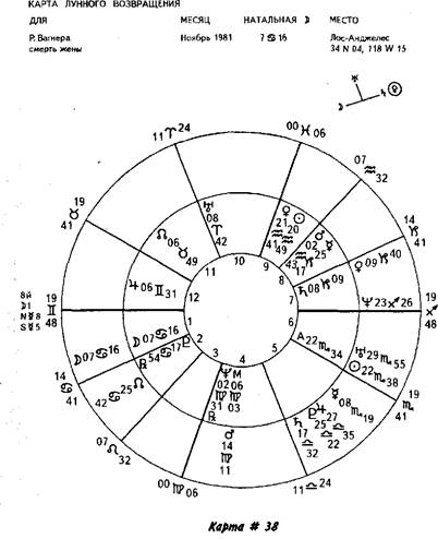 В карте лунного возвращения (карта #38) на Асцендент приходится восьмой натальный дом Вагнера. Луна, представь ляющая женщин в его жизни, находится в первом доме; натальный Меркурий, управитель карты лунного возвращения, расположен в восьмом доме, а Меркурий лунного возвращения в пятом доме. Все это ясно указывает на то, что он будет иметь дело с вопросами восьмого дома, возможно затрагивающими его любовь, детей, инвестиции и/или творчество (пятый дом). Нетрудно все понять, когда факт уже свершился. Однако, если бы Вагнер обратился к вам в этот период, то, не зная о том, что произойдет, вы, вероятно, указали бы ему на возможные проблемы с налогами (восьмой дом). Точное соединение Солнца с натальным Асцендентом в шестом доме говорит о важности вопросов работы, здоровья и привычек в этот период. Восходящая Луна, которая управляет вторым домом, привлекает внимание к финансам и ценностям, а натальное Солнце в девятом доме говорит об ожидающих решения юридических вопросах или о запланированном путешествии. Мы не знаем об обстоятельствах личной жизни Вагнера в это время, но это некоторые из сфер активности на данный период. Нет ничего, что при взгляде вперед насторожило бы нас или указало бы на смерть его жены. Но при ретроспективном взгляде это событие ясно обозначено. Если мы изучим карту Натали Вуд на 1981 год (карта #39), то увидим, что прогрессивный Меркурий в 0°46' Девы формировал оппозицию к натальному Юпитеру и трин с натальной Луной. Дирекционный Сатурн в 29° Тельца был в секстиле с натальным Плутоном, а дирекционный Нептун в 0°20' Скорпиона формировал трин с натальным Юпитером и оппозицию к натальной Луне. Транзитный Сатурн приближался к натальному Асценденту.