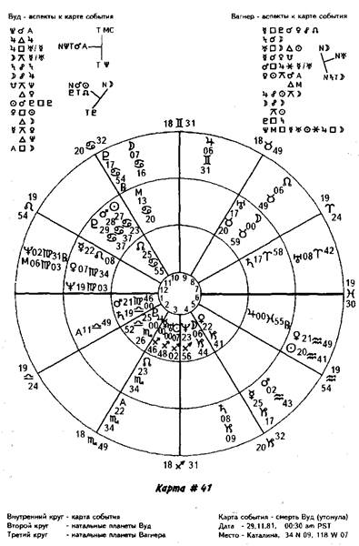 Эта карту вряд ли можно назвать сногсшибательной. Но если вы разместите вокруг нее (во втором круге) планеты Натали Вуд, то увидите, что Нептун формирует соединение с Асцендентом; Сатурн находится в соединении с куспидом восьмого дома; активируются те же конфигурации, что и в карте лунного возвращения. Солнце карты события находится в квадратуре к Венере Натали в двенадцатом доме; Марс формирует соединение с ее Нептуном. Все эти контакты ясно показывают нам, что ее утопление было несчастным случаем. Юпитер в карте события находится в трине с ее Юпитером, Нептун формирует квинконс с ее Солнцем, а Северный Лунный Узел — соединение с ним, подтверждая три наших потенциальных аспекта смерти. Эти же три аспекта могли указывать и на другую активность в другой данный момент времени. Если мы разместим натальные планеты Вагнера вокруг карты события (в третьем круге), они наглядно покажут нам его реакцию на трагедию. Его Сатурн формирует соединение с Луной, а его Луна находится в оппозиции к Луне карты события, указывая на возможный эмоциональный стресс, связанный с женой. Его Солнце формирует квинконс с Марсом и Асцендентом карты события. Его Юпитер, расположенный в натальной карте в седьмом доме, формирует квинконс с Луной карты события и оппозицию к Солнцу. Здесь опять мы имеем аспект Юпитера и квинконс. Южный Лунный Узел карты события находится в соединении с его натальным Юпитером, планетой-управителем Асцендента карты события. Так что опять налицо три указателя смерти — не его, а его жены и партнера. Если вы строите карту на ожидаемое событие, нужно соблюдать особые правила, касающиеся того, чего вы хотите достичь в рассматриваемой карте. Это совершенно иная ветвь астрологии, которую мы надеемся рассмотреть в будущей книге.