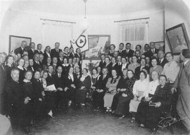 Первый Конгресс балтийских обществ Рериха. 1937 Сидят (слева направо): Е.А.Зильберсдорф, М.Лицис-Риекстинь (4), О.Я.Мисинь (5), Р.Я.Рудзитис(6), К.О.Валковский (7), Н.П.Серафинина (10), А.Виестур-Принцис (11), В.Сипавичюс (13), А.Вернер (15) У Знамени Мира – Ю.Д.Монтвидене, справа у картины – Б.Валушите