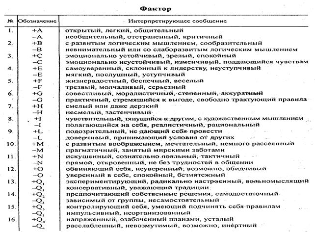Следует помнить о том, что первичные 16 личностных факторов не являются статистически независимыми: имеют место значимые статистические корреляции между факторами. Например, испытуемый, получивший высокий балл по фактору О («интропунитивность», «проницаемость границ Эго»), в 75 % случаев должен получить и высокий балл по фактору Q4 («напряженность базальных потребностей»). Это обусловлено тем, что данные факторы с высокими нагрузками входят в интегральную черту темперамента «тревожность» или «нейротизм». Точно так же «доминантность» (+E) коррелирует со «смелостью» (+H/), «сила Суперэго» (+G) - с «самоконтролем» (+Q3)> «чувствительность» (+I) -с «мечтательностью» (+М), «консерватизм» (-Q1) - с «конформизмом» (-Q2). Все эти корреляции обусловлены существованием описанных выше базисных черт, интегрирующих индивидные черты в определенные блоки - вторичные факторы. Полная система поправок представляет собой матрицу коэффициентов линейной регрессии 16x16 между всеми факторами, а скорректированный балл по i-му фактору рассчитывается подстановкой на место переменных Х1, Х2..., Х16, в уравнении множественной регрессии стенов по соответствующим факторам: