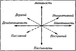 Рис. 25. «Четырехполюсное» описание черт «активность - пассивность» при ортогональных параметрах «адаптивность-дезадаптивность» Когда требуется социально-адекватное поведение по отношению к запрещающей норме, формируется житейский конструкт «послушный -дерзкий»; когда требуется социально-адекватное поведение по отношению к разрешающей норме, актуализируется конструкт «инициативный -пассивный» (рис. 26). Основными средствами диагностики черт на основе указанных выше представлений являются: 1) квазиобъективные тест-опросники, включающие поведенческие вопросы, объединенные в многомерные ключи; 2) контрольные списки прилагательных для субъективного стан-дартизоваынного описания человека человеком; 3) репертуарные решетки (об этой технике см. главу «Психодиагностика индивидуального сознания»).