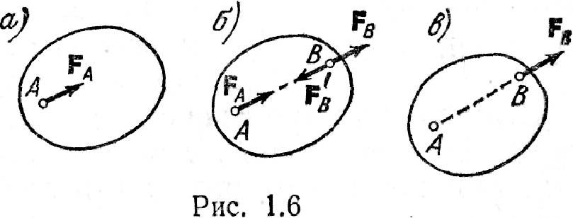 Аксиома 2. Не нарушая состояния абсолютно твердого тела, к нему можно прикладывать или отбрасывать силы тогда и только тогда, когда они составляют уравновешенную систему, в частности, если эта система состоит из двух сил, равных по модулю, действующих по одной прямой и направленных в противоположные стороны. Из этой аксиомы вытекает следствие: не нарушая состояния тела, точку приложения силы можно переносить вдоль линии ее действия.Действительно, пусть сила FА приложена к точке А (рис. 1.6, а). Приложим в точке В на линии действия силы FA две уравновешенные силы FB и F'B, полагая, что FB=FA (рис. 1.6, б). Тогда согласно аксиоме 2 будем иметь FA~FA, FB, F`B). Так как силы FА и FB обра зуют также уравновешенную систему сил (аксиома 1), то согласно аксиоме 2 их можно отбросить (рис. 1.6,в). Таким образом, FA~FA,FB,F`B)~FB, или FA~FB, что доказывает следствие. Это следствие показывает, что сила, приложенная к абсолютно твердому телу, представляет собой скользящий вектор. Обе аксиомы и доказанное следствие нельзя применять к деформируемым телам, в частности, перенос точки приложения силы вдоль линии ее действия меняет напряженно-деформированное состояние тела.