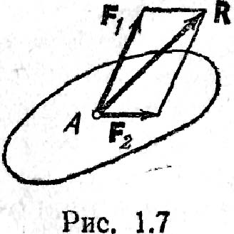 Аксиома 3. Не меняя cостояния тела, две силы, приложенные к одной его точке, можно заменить одной равнодействующей силой, приложенной в той же точке и равной их геометрической сумме (аксиома параллелограмма сил). Эта аксиома устанавливает два обстоятельства: 1) две силы F1 и F2 (рис. 1.7), приложенные к одной точке, имеют равнодействующую, т. е. эквивалентны одной силе (F1,F2)~R; 2) аксиома полностью определяет модуль, точку приложения и направление равнодействующей силы R=F1+F2.(1.5) Другими словами, равнодействующую R можно построить как диагональ параллелограмма со сторонами, совпадающими с F1 и F2. Модуль равнодействующей определится равенством R=(F12+F22+2FlF2cosa)1/2, где а—угол между данными векторами F1 и F2. Третья аксиома применима к любым телам. Вторая и третья аксиомы статики дают возможность переходить от одной системы сил к другой системе, ей эквивалентной. В частности, они позволяют разложить любую силу R на две, три и т. д. составляющие, т. е. перейти к другой системе сил, для которой сила R является равнодействующей. Задавая, например, два направления, которые лежат с R в одной плоскости, можно построить параллелограмм, у которого диагональ изображает силу R. Тогда силы, направленные по сторонам параллелограмма, составят систему, для которой сила R будет равнодействующей (рис. 1.7). Аналогичное построение можно провести и в пространстве. Для этого достаточно из точки приложения силы R провести три прямые, не лежащие в одной плоскости, и построить на них параллелепипед с диагональю, изображающей силу R, и с ребрами, направленными по этим прямым (рис. 1.8).