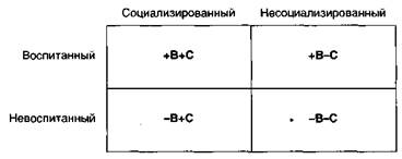Рис. 11. Варианты процессов воспитания и социализации На схеме изображены 4 комбинации: 1) +В+С — это высококультурный нравственный человек, который вместе с тем хорошо знаком с законами жизни и не теряется ни в какой ситуации. 2) +В—С — это тип интеллигента, который обладает высокими нравственными принципами, но совершенно не знает жизни и не умеет к ней приспособиться. 3) -В+С — это социальный тип, который в народе называют «трамвайным хамом»: он прекрасно знает жизнь, но совершенно не имеет нравственных убеждений. 4) —В—С — очень редкий тип человека, который не знает жизни и не имеет нравственных убеждений. С социологической точки зрения в основе социализации лежит процесс освоения социальных ролей и усвоения культурных норм. Невозможно обучиться социальной роли по книжкам или методом деловой игры, хотя усовершенствовать себя в ней таким образом можно. Вождь или король воспитывает себе преемника многие годы; исполнителя этой роли воспитывает окружение, практика принятия управленческих решений, которую приходится осваивать, реально став королем или вождем. Каждая социальная роль включает множество культурных норм, правил и стереотипов поведения, незримыми социальными нитями — правами, обязанностями, отношениями — она связана с другими ролями. И все это надо осваивать. Вот почему к социализации применим термин не «обучение», а «освоение». Он шире по содержанию и включает в себя обучение как одну из частей. Поскольку на протяжении жизни нам приходится осваивать не одну, а целое множество социальных ролей, продвигаясь по возрастной и служебной лесенке, процесс социализации продолжается всю жизнь. До глубокой старости человек меняет взгляды на жизнь, привычки, вкусы, правила поведения, роли и т.п. Понятие «социализация» объясняет то, каким образом человек из существа биологического превращается в существо социальное. Ни социализация, ни воспитание не являются социальными институтами. И если в литературе встречается выражение «воспитание как социальный институт», то надо помнить, что автор допускает грубую методологическую ошибку. Социальным институтом, точнее сказать целой системой институтов, является только образование. Оно осуществляется че Воспитание — направленный процесс влияния одного человека на другого с целью привить ему нужные правила поведения и/или этические нормы. В отличие от него социализация представляет собой непланируемый, нерегулируемый, нецеленаправленный процесс взаимодействия людей с людьми или людей с вещественной средой. Как педагогическое управленческое воздействие воспитание тесно связано с процессами обучения, образования, подготовки, обеспечением грамотности. Все они — яркие представители так называемых селективных, или избирательных, техник воздействия на сознание. Действительно, образование предполагает, что в школе человека обучают не всему подряд, а лишь тому, что отобрано учителем, методическим советом, учеными и министерством образования. И родители, воспитывая своего ребенка, прививают ему не любые ценности, но только положительные. Они учат его добру, справедливости, мужественности, патриотизму. А вот социализация отличается своей всеядностью. Она не относится к числу ни селективных техник воздействия, ни к целенаправленным процессам. Она стихийна и неуправляема — м