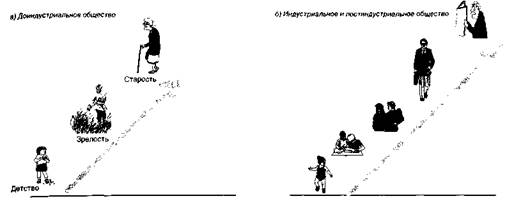 Рис. 13. Стадии жизненного цикла и ребенок узнает, что, произнося подобные слова, он получает вознаграждение: поцелуй, сладкое питье или нежность. По прошествии времени ребенок узнает еще больше слов и правил поведения. Маленькая девочка научится должному поведению, которое вначале не зависит от специфики пола и больше основывается на общекультурных универсалиях. По мере того Беспомощность ребенка, его зависимость от окружения заставляют думать, что процесс социализации проходит при чьей-то посторонней помощи. Так оно и есть. Помощники — это люди и учреждения. Их называют агентами социализации. Забота родителей очень важна для подростков даже тогда, когда они проводят больше времени в одиночестве или со сверстниками, чем дома в семье. Подростки продолжают оглядываться на родителей в поисках любви и внимания, а также правил или, по меньшей мере, каких-то образцов поведения. Взаимоотношения, складывающиеся между родителями (матерью и отцом) и детьми, являются решающим моментом социализации. Они обнаруживают себя в самый ответственный момент — когда человек наиболее восприимчив к добру и злу, когда он наиболее доверчив и открыт всему новому, а именно в период младенчества. Вторая характерная черта — взаимоотношения продолжаются всю жизнь и, следовательно, оказывают наиболее длительное воздействие. Третья черта — родительско-детские отношения являются самыми тесными и близкими отношениями, которые только могут существовать в человеческом обществе. Многие убеждены, что родительские чувства передаются биологически и пробуждаются с появлением первого ребенка. Действительно, у всех живых существ — от птиц до млекопитающих — родительская забота запрограммирована генетически. Однако для человеческих существ это справедливо наполовину. Родительство — прежде всего социально приобретаемое отношение. Американского психолога и этнографа Э. Эриксона по праву считают основателем новой стратегии — психоисторического метода, который представляет собой применение психоанализа к истории. Э. Эриксон проводил полевые этнографические исследования воспитания детей в двух индейских племенах и сравнивал их с воспитанием детей в городских семьях США. Он обнаружил, как уже упоминалось, что в каждой культуре имеется свой особый стиль материнства, который каждая мать воспринимает как единственно правильный. Однако, как подчеркивал Э. Эриксон, стиль материнства всегда определяется тем, что именно ожидает от ребенка в будущем та социальная группа, к которой он принадлежит, — его племя, класс или каста. Практически только у людей детей намеренно подкидывают или передают на воспитание в другую семью либо передают под опеку государства. Только человеческие существа придумали специальные учреждения для оставляемых детей и систему санкций, при помощи которых либо наказывают за нарушение, либо поощряют за соблюдение отношений родительства. Уже в глубокой древности, судя по сохранившимся источникам, детей убивали, бросали на произвол судьбы, продавали в рабство, закладывали, калечили, терроризировали и насиловали собственные родители. Подобные