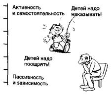Способы родительского контроля также можно представить в виде шкалы, на одном полюсе которой высокая активность, самостоятельность и инициатива ребенка, а на другом — пассивность, зависимость, слепое послушание (рис. 18). За этим кроется не только механизм распределения власти в семье, но и разное направление внутрисемейной коммуникации: в одних случаях она направлена преимущественно или исключительно от родителей к ребенку, в других — от ребенка к родителям. За противоположными полюсами шкалы скрываются самые разные, порой неожиданные, а временами и трагические обстоятельства. Так оно и есть, поскольку за этими типами отношений стоит не только распределение власти, но и разное направление внутрисемейной коммуникации: в одних случаях она направлена преимущественно или исключительно от родителей к ребенку, в других — от ребенка к родителям. Власть в семье может целиком концентрироваться в руках одного или обоих родителей, а может равномерно распределяться между всеми членами семьи. В таких случаях говорят о делегировании прав и полномочий вниз по возрастной пирамиде. Это явление напоминает делегирование служебной власти вниз по социальной иерархии. Привлекая ребенка к участию в принятии семейных решений, наделяя его известным кругом полномочий и ответственности, родители с большей вероятностью сформируют в своем чаде самостоятельную и независимую личность. Разумеется, объем делегируемых прав различается в зависимости от возраста ребенка, его психологической и социальной готовности взять на себя дополнительные хлопоты, типа принимаемых решений. В одних вопросах старшеклассники имеют почти полную самостоятельность, в других, например финансовых, право решать остается за родителями. Кроме того, родители не всегда практикуют один и тот же стиль дисциплины: отцы, как правило, воспринимаются юношами и на самом деле бывают более жесткими и авторитарными, чем матери, так что общий семейный стиль в известной мере принимает компромиссный характер. Отец и мать могут взаимно дополнять, а могут и подрывать влияние друг друга. Наилучшие взаимоотношения старшеклассников с родителями складываются чаще всего тогда, когда родители придерживаются демократического стиля воспитания. Этот стиль в наибольшей степени способствует воспитанию самостоятельности, активности, инициативы и ответственности. Поведение ребенка не директируется, не управляется, а гибко направляется в желаемое русло. Родители, подобно мудрому менеджеру, создают полную иллюзию того, что ребенок сам пожелал сделать это, принять такое решение, совершить данный поступок. Подобная ситуация достигается при соблюдении следующих правил: • родитель всегда объясняет мотивы своих требований и поощряет их обсуждение подростком; • власть используется лишь в меру необходимости; • в ребенке ценится как послушание, так и независимость; • родитель устанавливает правила и твердо проводит их в жизнь, но не считает себя непогрешимым; • он прислушивается к мнению ребенка, но не исходит только из его желаний. Демократический стиль воспитания занимает золотую середину между двумя крайностями — авторитарным и попустительским стилями. Крайности всегда нехороши: авторитарный стиль воспитывает зависимость и покорность, попустительский — заносчивость и нетерпимость. 
