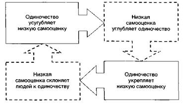 Рис. 27. Замкнутый круг одиночества и самооценки: одиночество и низкая самооценка взаимно усиливают друг друга житься на меньшее число людей в случае необходимости и обычно толком не знают своих соседей. Одинокие люди — это неудовлетворенные люди. Они не удовлетворены своей жизненной ситуацией, количеством имеющихся друзей и качеством дружеских связей, своими брачными отношениями или любовными связями, количеством случайных и личных бесед, происходящих задень, и своей сексуальной жизнью.