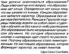 Школа для индусов — это прежде всего Учитель Гуру — это духовный наставник и учитель, который ведет своего последователя, или ученика (шишья или чела), по духовному пути, направляя его к конечной цели — абсолютной самореализации. Когда приходит надлежащее время, гуру совершает обряд посвящения своего ученика и сообщает ему священную молитву-мантру, которая должна направлять его до конца жизни. Согласно учению тантризма, гуру-человек является лишь земным проявлением Всевышнего Гуру. Традиционно гуру воплощает высшие ценно- Шри Сатья Саи Баба. Летние ливни в Бриндаване. Курс лекций по индийской культуре и духовности (http://sss.vn.ua/brind73.htm). сти, к которым стремится простой человек. Лучше всего, если ученик живет в течение 12 лет со своим учителем, постигая Путь Жизни. Истинный гуру со своими учениками живет на добровольные пожертвования верующих, пребывая в самых глубинах тишины. Человеку нужно искать своего гуру, который подвергнет будущего ученика строгой проверке и, возможно, даже отвергнет его. Выбранный однажды гуру навсегда остается высшим авторитетом для своего ученика. Приняв ученика в начале отношений, гуру часто, если не всегда, уничтожает этого ученика, чтобы создать его заново. Самостоятельным типом религиозной школы надо считать ашрам. Ашрамом называют уединенное жилище индийского аскета или учителя, которое является центром религиозного учения и практики. Это может быть