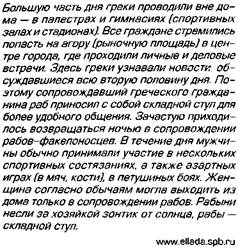 В школе дети занимались с тремя учителями. Первый назывался грамматистом. Он обучал грамоте, счету и письму, читал с учениками поэмы Гомера и басни Эзопа. За Гомером шли Гесиод и Феогнид ради их нравоучительных сентенций. Крупными отрывками заучивали наизусть их произведения. Вместо тетрадей школьники пользовались так называемыми диптихами, двумя скрепленными с одной стороны дощечками, которые раскрывались как книга или переплет. Внутренняя поверхность натиралась воском, на котором стилом (металлической палочкой) прорезались буквы и цифры и им же (вернее, его обратной стороной, где была лопаточка) стирались — saepe stylum verte! Края дощечек выступали, их можно было скрепить печатью, завязать веревкой и с другой стороны. В этом случае диптихи служили «конвертами» для писем, скрывая написанное на внутренних сторонах дощечек. Считать учились на камешках. Более сложные арифметические расчеты производили на абаке. Этот способ обучения известен и в современной школе22. В Древней Греции основным методом воспитания было подражание мифологическим образцам, в том числе гомеровским героям, которые выступали образцами поведения для благородного юноши-аристократа. Воспитание рассматривалось как одна из функций государства, а основным воспитательным институтом в VIII—VI вв. до н.э. служила система религиозных празднеств, требовавших предварительного обучения «мусическим искусствам». Мальчиков обучали обрядовым песням, исполняемым хором или соло, декламировали с ними торжественные гимны. Учил их этому кифарист, прививавший детям навыки игры на струнных инструментах — лире или кифаре. С 12 лет мальчики начинали заниматься гимнастикой. Руководил этими занятиями педотриб (дословно «тренирующий ребенка»). Государство и 22 Подосинов А.В., Щавелева Н.И. Lingua Latina. Введение в латинский язык и античную культуру. М., 1994. семья особенно заботились о том, чтобы мальчики выросли ловкими, сильными, гибкими и выносливыми, были подготовлены к военной службе. Пе-дотриб показывал детям, как метать копье и диск, тренировал их в беге и прыжках, занимался с ними борьбой, плаванием, верховой ездой, готовил к гимнастическим соревнованиям. Спортивные занятия проводились в специально подготовленных для этого помещениях — палестрах. Нередко уроки проводились под аккомпанемент флейты23.