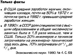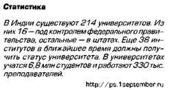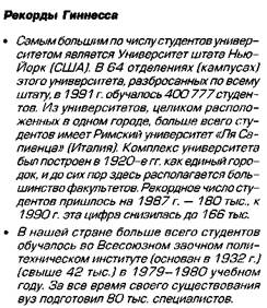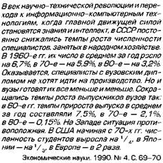 школа внесла главный вклад в создание советской интеллигенции, которая, вопреки идеологическому давлению и политическим преследованиям, прославила страну в области культуры и науки, внесла огромный вклад в мировую сокровищницу мысли. Ядром советской, а теперь уже и российской интеллигенции, выступают выпускники университетов. Русские дореволюционные университеты вобрали в себя все самое ценное, что было в мировой университетской практике. Они выступали одновременно центрами обучения и научных исследований, соединяя образовательные и изыскательские функции. Однако после революции 1917 г. картина изменилась. В СССР университеты в подавляющем большинстве случаев стали лишь обучающими центрами, отторгнутыми от передовых научных исследований и разработок. Как научные центры они не представляли большого интереса, явно проигрывая Академии наук и мощным отраслевым НИИ и КБ. Полномочия университетов в СССР не имели должного правового обеспечения. Им не принадлежали ни земля, ни здания и сооружения, социальный престиж и государственный статус университетов как образовательных центров был невысок. Зарплата профессоров не соответствовала ни дореволюционному уровню, ни мировым стандартам. Конкурс, хотя и был высоким, часто превращался в пустую формальность благодаря специальным спискам абитуриентов, поступающих по блату, за деньги или партийной принадлежности. Никакой университетской автономии не существовало. В результате университеты практически не отличались от обычных педагогических институтов. В 1994 г. в Российской Федерации насчитывалось свыше 40 государственных университетов, 80 государственных университетов технического, медицинского, педагогического, аграрного и других профилей, свыше 30 негосударственных университетов. Для сравнения: в Великобритании только два частных университета, остальные 96 — государственные, но они отнюдь 96 Высшая школа СССР за 50 лет. М., 1967. С. 8. не бесплатные. Граждане Британии до недавнего времени не платили за обучение, но с 1998 г. английские вузы стали взимать плату — максимум 1 тыс. фунтов в год (примерно 1700 долл.). Иностранцы платят в 5-10 раз больше97. В английских университетах сегодня обучается 1,6 млн студентов, т.е. 30% выпускников средних школ98. В Австралии высшее образование платное для всех студентов, и иностранные студенты платят в 2 раза больше. Анализ западной литературы показывает ведущую роль государственных вузов и университетов в высшей школе и государственного финансирования их деятельности (от 50% в США до 80-90% в странах За Обучение в университете во многих странах мира требует значительных расходов. Плата за учебу взимается как в частных, так и в государственных университетах. Как правило, конкурс в государственные университеты везде выше, поэтому большей части молодежи (в Японии четырем из пяти студентов) приходится пользоваться услугами частных университетов, которых большинство. Абитуриенты частных вузов, как правило, делают вступительные взносы, а став студентами, оплачивают лекции, пользование учебным оборудованием и т.д. Самые крупные взносы установлены в медицинских заведениях, где первый учебный год обходится студенту в сумму, более чем в 2 раза превышающую годовой доход рядового японского рабочего100. Лучшим в нашей стране университетом по праву считается Моско