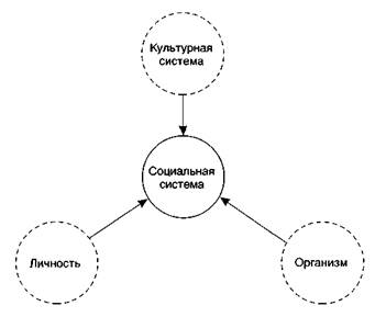 Рис. 36. Одна из частей берет на себя функции целого Проведя сравнение, неожиданно для себя обнаруживаем, как четыре равноправные части, ранее входившие в единое целое — систему человеческого действия, теперь распадаются и организуют новую структуру. Суверенные части выстраиваются в некую иерархию, где одна часть выполняет заглавную, а три другие — подчиненную роль. Куда-то исчезла система человеческого действия. Ее место заняла социальная система. Теперь она главная, но три другие части уже не части, а элементы окружения, или окружающие среды. Исчезнувшая система человеческого действия вскоре обнаруживается. Оказывается, она образует некую метасреду, поскольку располагается и сверху и снизу. Комментаторы не пришли к единой интерпретации системы человеческого действия, так как Парсонс, как справедливо отмечает X. Абельс, не всегда соблюдает понятийную строгость. Одни считают, что в нее входят четыре подсистемы, не связанные иерархическим соподчинением, другие полагают, что между ними возможна иерархия. Несмотря на разногласия, исследователи сходятся в одном: Парсонс выделяет следующие четыре подсистемы общей системы социального действия: • биологический организм: индивидуальная психофизическая конституция человека, включая инстинкты и биологические потребности, влияющие на человеческое поведение; • система личности: мотивационная структура индивида; организм и система личности вместе образуют «базисную структуру» (basic frame of reference) и представляют собой совокупность индивидуальных потребностей и диспозиций {need-disposition system of the individual actor); • социальная система. Под ней понимается совокупность образцов поведения, социальное взаимодействие (интеракция) и социальные роли; • система культуры, куда относятся культурные ценности и социальные нормы, необходимые для стабильного функционирования общества.