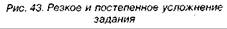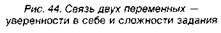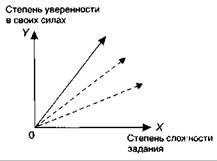 в выгоде окажется не только предприниматель, получивший более высокую прибыль, но и сам работник, которому трудиться будет намного интереснее. Под присмотром опытных инструкторов рабочей бригаде с промежутком в один или несколько месяцев усложнялось задание. При этом опытные наставники предварительно обучали рабочих тому, как решать новую задачу. Они добивались того, чтобы обучаемый закрепил новые трудовые навыки путем длительной тренировки, а затем приступал к самостоятельному исполнению. Как только работник в совершенстве овладевал новой операцией, давал максимум эффективности и сохранял такой максимум в течение какого-то времени, инспектор-наставник решал вопрос об усложнении задания и очередном скачке производительности. Ф. Тейлор прекрасно понимал, что усложнение заданий — дело чрезвычайно деликатное. Стоит перегнуть палку, как вместо пользы принесешь производству вред. Постепенным усложнением работы можно привлечь работника к эффективному труду, а скачкообразным и непомерным — отпугнуть от работы. Если на декартовой системе координат нулевую отметку, с которой стартовал процесс усложнения работы, изобразить в виде горизонтальной оси ОХ, то обозначенная сплошной линией стрелка покажет резкое усложнение задания, а расположенные ниже две пунктирные стрелки укажут более рациональный вариант — постепенное усложнение задания (рис. 43). Если поставить неумеренно сложную задачу, то у рабочего появится страх, пропадет уверенность в собственных силах, фрустрация, предпосылка избегать сложных задач. Рассчитывая трудовые нагрузки на одного рабочего, Тейлор устранял все ошибочные, медленные и бесполезные движения. Нерациональные действия всегда непроизводительны, они обременительны и для организма человека, и для производства. Создавая идеальные прямые рабочих движений, отсекающие всякие изгибы и отклонения, Тейлор в конечном итоге стремился найти идеал эффективного труда, самый правильный метод. Принцип экономии сил — движущий механизм его учения о труде — требовал, чтобы максимальный результат достигался при наименьших затратах. В экспериментальных условиях устранение лишних движений давало прирост производительности труда в 2—3 раза. Теперь на декартовой системе координат изобразим осью ОХ степень сложности задания, а осью ОУ— степень уверенности в своих силах. Новый график показывает связь двух этих переменных (рис. 44).
