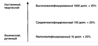 Рис. 46. Тейлоровская шкала видов труда и размера премиальных Премиальные не выдавались всем рабочим одинаково. Предположим, что малоквалифицированный, средне- и высококвалифицированный работники повысили производительность труда на одну и ту же величину, скажем на 20%. Насколько повышать им зарплату? Тоже на 20%? Поступить так значило бы уравнять высоко-, средне- и малоквалифицированный труд. А Тейлор категорически возражал против уравниловки. Он предложил подходить дифференцированно не только к разному объему труда, но также к разной квалификации труда и к разным видам труда. Общий принцип звучал так: чем более интеллектуальным является данный вид труда, тем выше премиальные; чем выше квалификация, тем больше премиальные. На основе длительных наблюдений и расчетов Тейлор построил специальную шкалу. Наверху — высококвалифицированный (творческий) труд, внизу — малоквалифицированный (рутинный) труд. По мере роста квалификации растет доля умственного труда. Механик — вверху, чернорабочий — внизу. Первый работает головой, второй — руками. Все виды труда можно расположить подобным образом. Виды труда различаются трудовым вкладом в общее дело. Наибольший он у менеджера и механика, наименьший — у чернорабочего. Следовательно, если каждый повысил производительность труда на равную величину, скажем на те же 20%, получить они должны неравные премии. Наибольшую — менеджер, наименьшую — чернорабочий. Таким образом, Тейлор классифицировал все виды работ по содержанию, сложности и характеру труда, установив для каждой премиальную вилку. Менеджер принес пользу компании на 1000, а чернорабочий на 10 долл. Прибавим к той и другой величине одинаковый процент премиальных (20%). Что получилось? Один процент наверху стоит больше, чем внизу. А если премию измерять не в относительных, а в абсолютных величинах, и разным по квалификации рабочим выдать одинаковую премию, например по 15 долл., малоквалифицированный рабочий скажет: «Как легко зарабатывать деньги!» Высокооплачиваемый же обидится: «Я внес вклад на 1000 долл., а премию получил в 15. Где же справедливость?» И в самом деле, прибавка в 15 долл. к 10-долларовой зарплате чернорабочего выглядит приличным вознаграждением, а та же добавка к 1000-долларовому окладу менеджера не почувствуется. Пропорционально этому мотивация у первого возрастает, а у второго уменьшается. В действительности второго мы не премировали, а огорчили. Вознаграждать за одно и то же количество перевыполнения нормы надо по-разному, в зависимости от сложности труда. Иначе говоря, чем сложнее