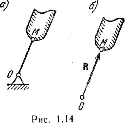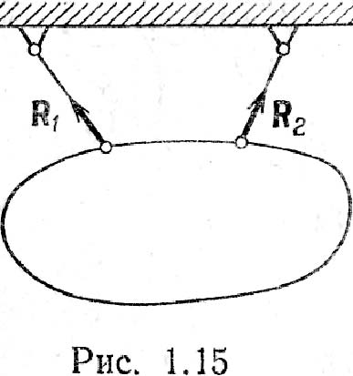 Принцип освобождаемоcти: всякое несвободное тело можно рассматривать как свободное, если действие связей заменить реакциями их, приложенными к данному телу. В статике полностью определить реакции связей можно с помощью условий или уравнений равновесия тела, которые будут установлены в дальнейшем, но направления их во многих случаях можно определить из рассмотрения свойств связей. В качестве простейшего примера на рис. 1.14, а представлено тело, точка М которого соединена с неподвижной точкой О при помощи стержня, весом которого можно пренебречь; концы стержня имеют шарниры, допускающие свободу вращения. В данном случае для тела связью служит стержень ОМ; стеснение свободы перемещения точки М выражается в том, что она вынуждена находиться на неизменном удалении от точки О. Сила действия на такой стержень должна быть направлена по прямой ОМ, и согласно аксиоме 4 сила противодействия стержня (реакция) R должна быть направлена вдоль той же прямой. Т. о., направление реакции стержня совпадает с прямой ОМ (рис. 1.14, б). Аналогично сила реакции гибкой нерастяжимой нити должна быть направлена вдоль нити. На рис. 1.15 показано тело, висящее на двух нитях, и реакции нитей R1 и R2. Силы, действующие на несвободное тело, делят на две категории. Одну категорию образуют силы, не зависящие от связей, а другую– реакции связей. При этом реакции связей носят пассивный характер– они возникают потому что на тело действуют силы первой категории. Силы, не зависящие от связей, называют активными, а реакции связей– пассивными силами. На рис. 1.16, а вверху показаны две равные по модулю активные силы F1 и F2, растягивающие стержень АВ, внизу показаны реакции R1 и R2 растянутого стержня. На рис. 1.16, б вверху показаны активные силы F1 и F2, сжимающие стержень, внизу показаны реакции R1 и R2 сжатого стержня.