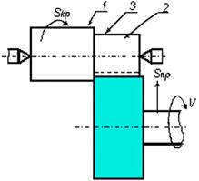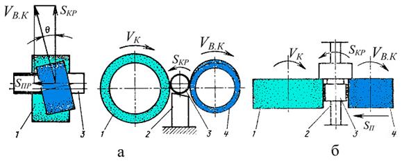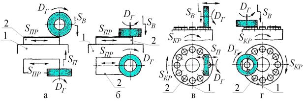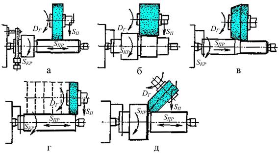 Кругле шліфування циліндричних поверхонь може бути виконане по одній з чотирьох схем (рис. 3.2). При шліфуванні з подовжньою подачею (рис. 3.2, а)заготовка обертається рівномірно (SКР) і скоює поворотно-поступальну ходу (SПР). В кінці кожного ходу заготовки шліфувальний круг автоматично переміщається на величину SП і при наступному ходу зрізається новий шар металу певної глибини, поки не буде досягнутий необхідний розмір деталі. Швидкість VК обертального руху круга забезпечує швидкість різання. Продуктивний спосіб обробки – врізне шліфування (рис.11,2, б) застосовують при обробці жорстких заготовок в тих випадках, коли ширина шліфованої ділянки може бути перекрита шириною шліфувального круга. Круг переміщається з постійною подачею SП (м/об. заг) до досягнення необхідного розміру деталі. Цей же метод використовують при шліфуванні фасонних поверхонь і кільцевих канавок. Шліфувальний круг заправляють відповідно до форми поверхні або канавки.