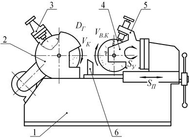 Рисунок 3.4. Схеми обробки на внутрішньошліфувальних верстатах 3.2.3 Обробка заготовок на бесцентрово-шліфувальних верстатах. Процес шліфування на цих верстатах характеризується високою продуктивністю. Заготовки обробляють в незакріпленому стані, і для них не вимагається центрових отворів. На станині 1 бесцентрово-шліфувального верстата (рис. 3.5) встановлені два круги: шліфуючий на бабці 2і ведучий на бабці 4. Кожний з кругів піддається періодичній правці за допомогою механізмів 3 і 5. Заготовка обертається на ножі 6 і одночасно контактує з обома кругами. Щоб заготовка переміщалася по ножеві з подовжньою подачею, бабку ведучого круга повертають на невеликий кут. Якщо шліфують заготовки з уступами, то бабку веденого круга не повертають, а вся вона переміщається по направляючих станини з подачею до певного положення. Заготовку 3(рис. 3.6, а)встановлюють на ніж 2 між двома кругами – шліфуючим 1 і ведучим 4. Ці круги обертаються в одному напрямі, але з різними швидкостями. Тертя між ведучим кругом і заготовкою більше, ніж між нею і шліфуючим кругом. Внаслідок цього заготовка обертається з швидкістю, близькою до колової швидкості ведучого круга. Перед шліфуванням провідний круг встановлюють під кутом (1–7°) до осі обертання заготовки. Вектор швидкості цього круга розкладається на складові і виникає (рис. 3.6). подовжня подача SПР. Тому заготовка переміщається по ножеві вздовж своєї осі і може бути прошліфована на всій довжині. Чим більше кут θ, тим більше подача. Такі верстати легко автоматизувати, встановивши похилий лоток, по якому заготовки сповзатимуть на ніж, проходитимуть процес шліфування і потраплятимуть в тару.