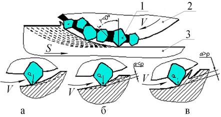 3.3. Види робіт, що виконують на верстатах шліфувальної групи Абразивний інструмент - це тверді тіла, що мають правильну геометричну форму і складаються з зерен абразивних матеріалів, скріплених між собою зв'язуванням. На плоскошліфувальних верстатах звичайно використовують плоскі прямі (ПП), чашкові конічні (ЧК) і циліндричні (ЧЦ) шліфувальні кола. Для виготовлення кіл застосовують електрокорунд, карбід кремнію і кубічний нітрид бора. Шліфування є операцією чистової, як правило – фінішної обробки поверхонь самої різноманітної форми, та дає можливість одержати шорсткість обробленої поверхні і забезпечує точність 6…7 квалітету. Шліфуванню піддаються як м’які матеріали, так і дуже тверді, загартовані. Особливістю цього процесу є те, що стружка знімається дрібними абразивними зернами 2, хаотично розміщеними в корпусі шліфувального круга 1 і скріпленими між собою за допомогою зв’язки 3. Для зерен використовують, як правило, штучні абразивні матеріали, як то: Електрокорунди (електрокорунд нормальний, білий, титанистий, хромистий, монокорунд), які в своїй основі мають окис алюмінію – глинозем, оброблений за спеціальною технологією; Карбіди кремнію (чорний і зелений), які більш тверді, ніж електрокорунди, але і більш крихкі. Тому вони частіше використовуються для обробки твердих матеріалів, загострювання інструментів, тощо; Карбід бору – використовується як шліфувальний порошок; Кубічний нітрид бору (ельбор, белбор, гексаніт, ісміт) – надтвердий матеріал, що застосовується для чистового шліфування твердих чорних матеріалів; Штучний алмаз – використовується, як правило, для чистового загострювання твердих сплавів, кераміки і надтвердих матеріалів. На відміну від ріжучих інструментів, абразивні зерна 1 в крузі 2 орієнтовані вільно, виступають на різну висоту із корпуса круга, а також мають значно більший, у порівнянні із ріжучим інструментом, радіус заокруглення ріжучого леза r та від’ємний передній кут – γ < 0º. Це приводить до того, що на досить значному проміжку шляху контакту між заготовкою 3 і вершиною зерна воно не зрізає стружку, а втискується в поверхню різання, пластично її деформуючи (рис. 3.10, а, б). Лише коли радіус заокруглення ріжучого леза r стає більшим товщини зрізуваного шару (рис. 3.10, в), починається процес зрізання стружки. Ця особливість процесу шліфування є причиною виникнення досить значних сил різання, інтенсивного тепловиділення, яке може приводити навіть до згоряння стружки і виникнення пригарів на обробленій поверхні.