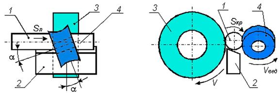 Якщо довжина оброблюваної поверхні невелика і не перевищує ширини шліфувального круга, більш продуктивним є процес врізного шліфування (рис. 3.11, б). За цією схемою круг крім обертання здійснює рух на врізання (поперечна подача врізання) у заготовку, що обертається із круговою подачею. Процес обробки закінчується, коли круг доходить до упору, після чого деталь виконує ще декілька вигладжуючих обертів. Обробка внутрішніх циліндричних поверхонь (рис. 3.11, в) виконується за такими ж кінематичними схемами, що і зовнішніх. Відмінність лише в тому, що через малу жорсткість кріплення шліфувального круга він може зрізати набагато менші глибини різання, ніж при зовнішньому шліфуванні. Обробка гладких (без уступів) зовнішніх циліндричних поверхонь може також здійснюватись за схемою безцентрового шліфування (рис. 3.12). Оброблювана заготовка 1 підтримується спеціальним ножем 2 між двома абразивними кругами, один із яких є ріжучим 3, а інший - ведучим 4. За рахунок того, що вісь обертання ведучого круга 4 нахилена під деяким кутом