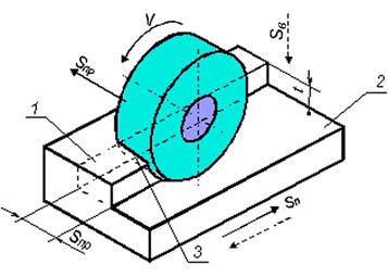 Плоскі поверхні можуть оброблятися або периферією круга, або його торцем. Як правило, ширина оброблюваної поверхні більша за ширину круга (рис. 3.13, а), тому, крім зворотно-поступального руху поздовжньої подачі заготовки, сам круг здійснює поперечне переміщення з подачею SП після кожного подвійного ходу стола. Величина поперечної подачі призначається від 0,2 до 0,8 ширини шліфувального круга для кожного оберту деталі.