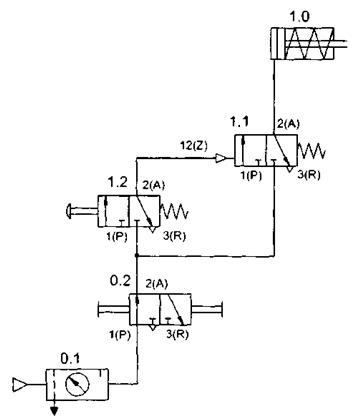 Розподільник з ручним керуванням від кнопки 1.2 при спрацюванні відкриває прохід повітрю від каналу живлення 1(Р) до вихідного каналу 2(А), де з'являється пневматичний сигнал, що поступає на вхід 12(2) керуючого розподільника 1.1. Цим сигналом розподільник 1.1 перемикається, долаючи силу дії пружини, після чого канал живлення 1(Р) з'єднується з вихідним каналом 2(А), відкриваючи прохід повітрю в порожнину циліндра. Поршень циліндра починає рухатися, шток висувається. Сигнал на керуючому вході 12(2) розподільника 1.1 існуватиме, і шток циліндра залишатиметься у висунутому положенні до тих пір, поки буде натиснута кнопка 1.2. Це є непряме керування циліндром від кнопки (керування відбувається не безпосередньо розподільником, а за допомогою додаткових пристроїв). Якщо кнопку відпустити, зворотна пружина перемістить розподільник 1.2 в початкове положення, відсікаючи вихідний канал 2(А) від живлення і сполучаючи його з атмосферою через канал 3(П). Це приведе до зникнення сигналу керування на розподільнику 1.1, який під дією пружини повертається в початкове положення, сполучаючи порожнину циліндра з атмосферою. При цьому пружина циліндра 1.0 переміщає поршень з штоком в початкове положення.