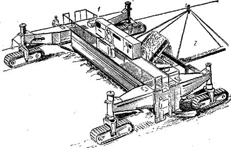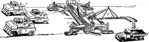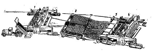 / — профилировщик основания ДС-97; 2 - навесной конвейер-перегружатель ДС98; 3 — автомобиль самосвал КрАЗ 256Б на разгрузке смеси; 4- профилировщик на распределениисмеси