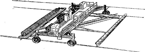 прокладки для швов расширения со штырями и их поддерживающей арматурой устанавливают на подготовленное основание и закрепляют. После прохода бетоноукладчика положение прокладки исправляют вручную. Если покрытие должно быть армировано, арматуру также заблаговременно выставляют на основание. В этом случае укладка бетонной смеси возможна только через бункер распределителя. Строительство покрытия. К работе по строительству покрытия приступают после завершения подготовительных работ, включая подготовку путей подвоза смеси, готовность к работе ЦБЗ и бетоноукладочпого комплекта, наличие материалов для ухода за бетоном и т. д. Распределение бетонной смеси с припуском па уплотнение обычно производят распределителем ДС-99 (рис. 43) Допустимо распределение смеси бетоноукладчиком при возможности выгрузки ее из автомобиля-самосвала непосредственно на основание. Распределение бетонной смеси ведут равномерно по всей ширине покрытия. Разрыв между распределителем и бетоноукладчиком в зависимости от погоды составляет от 10 до 30 м. Важнейшей технологической операцией является уплотнение бетонной смеси и формирование покрытия, выполняемое бетоноукладчиком ДС-101 (рис.44). До бетонирования производят предварительную, а затем в процессе пробного бетонирования окончательную настройку рабочих органов всех машин комплекта. Бетоноукладчик перемещается со стабильной скоростью. Кроме того, необходимо, чтобы глубинные вибраторы были полностью заглублены в смесь, а перед соответствующими рабочими органами были валики бетонной смеси высотой 20—25 см, что обеспечивает сплошность поверхности покрытия. Вы-